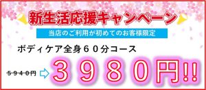 只今、ほぐしの館高槻店ではご新規様限定のお得な新生活応援キャンペーンを開催しております!!